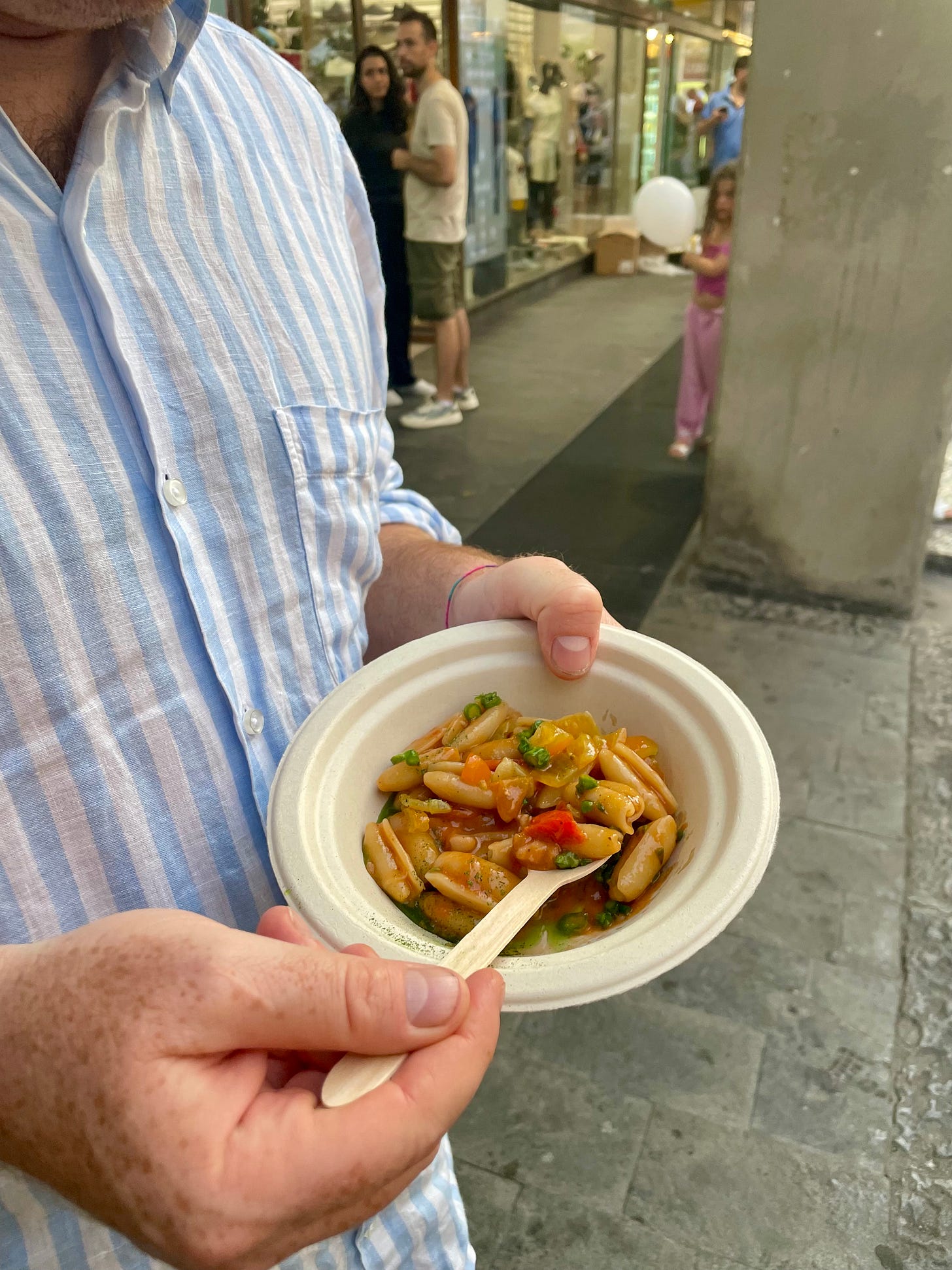 I laughed, threw caution to the wind, and climbed on the back of his moped and draped my arms around his shoulders, telling him to be careful. My husband climbed on the back, and I was sandwiched between two men as we slowly climbed up the mountain until we reached the festival entrance. I reached into my purse to give him a few euros for this ride, and he said, “Don’t worry about it - have fun!”. I was shocked. We walked into the festival with huge smiles on our faces, ready to eat some pasta.